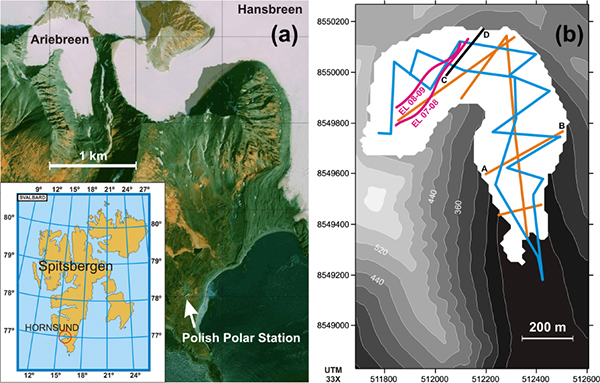 Most glaciers investigated in the Hornsund area are known to be polythermal, such as Hansbreen and Werenskioldbreen (Pälli et al. 2003). The small size of Ariebreen, however, might suggest that it is a cold glacier, although it was previously classified as polythermal (Jania 1988). We aim to verify, from ground-penetrating radar (GPR) data, whether Ariebreen is cold or polythermal as this may be important for the erosional capacity and the suspended sediment load of the Ariebekken river. This water discharge stream from Ariebreen flows out of Ariedalen valley to Revdalen valley through a wide delta, where biological and geomorphological studies have been conducted for 50 years (e.g., Kuziemski 1968), hence the interest to characterize the hydrothermal regime of the glacier.