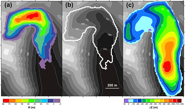 (a) Map of ice thickness, H, of Ariebreen in 2006/07, determined from the radar profiles shown in Fig. 1. Contour line interval is 10 m. The estimated glacier-averaged error in ice thickness is 3.29 m. (b) Bedrock topography of Ariebreen, determined by subtracting the ice thickness shown in Fig. 3 from the surface topography shown in Fig. 2c. Contour line interval is 40 m. The estimated error in bedrock elevation is 3.44 m. (c) Map of surface elevation changes, ΔZ, of Ariebreen during the period 1936–2007. Negative values mean thinning. Contour line interval is 10 m. The estimated error is 13.64 m.