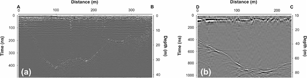 Examples of radar sections: (a) 200-MHz radar, corresponding to a transverse profile on the lower glacier (profile A–B in Fig. 1; (b) 25-MHz radar, corresponding to a transverse profile on the upper glacier (profile C–D in Fig. 1. Both are free from the internal diffractions and scattering typical of temperate ice.