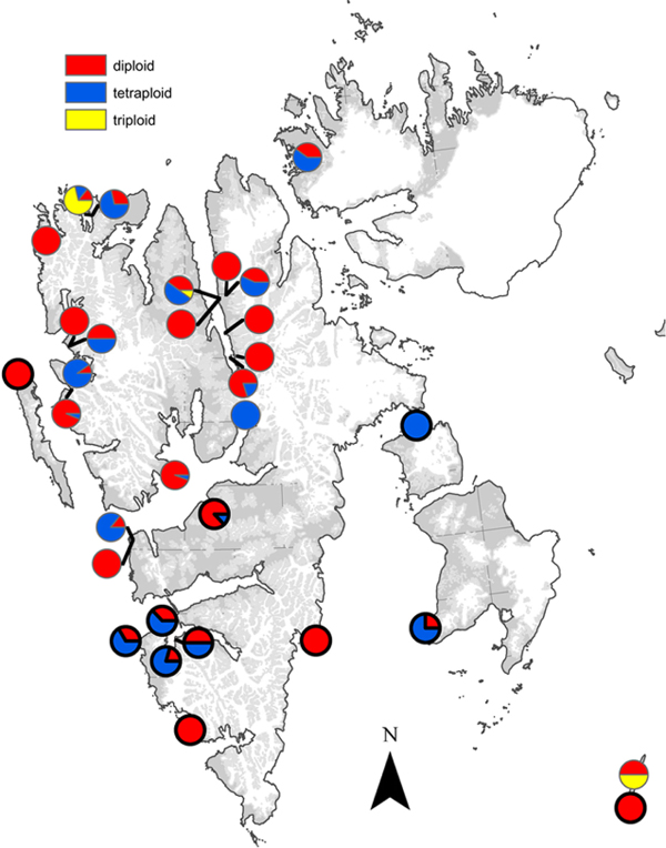 Distribution of diploid, triploid and tetraploid individuals of Saxifraga oppositifolia in Svalbard based on 193 samples analysed by flow cytometry viewed as propositions within the 20 sampling sites analysed in this study (Table 1), and selected samples from Müller et al. 2012 (encircled in black), where ploidy levels were inferred from amplified fragment length polymorphisms patterns in combination with flow cytometry.
