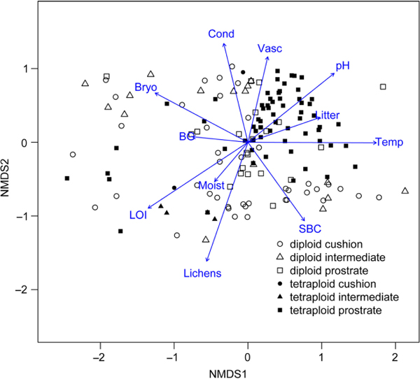 Non-metric multidimensional scaling (NMDS) plot showing 148 vegetation plots where diploid and tetraploid individuals of Saxifraga oppositifolia were sampled in Svalbard, including 11 fitted environmental variables. Plots with triploids, plots without vascular vegetation cover and plots from two sampling sites in Wijdefjorden (Location 5; Table 1), which had a strongly deviating species composition compared to the other sampling sites, were excluded from the presented multivariate analysis, in order to achieve a better resolution of the remaining sites. The following terms have been abbreviated: bare ground (BG), bryophyte cover (Bryo), conductivity (Cond), lichen cover (Lichens), coverage of litter (Litter), loss on ignition (LOI), soil moisture (Moist), soil pH (pH), soil biological crust (SBC), soil temperature (Temp) and vascular plant cover (Vasc).