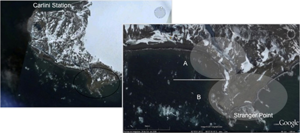 Study area. Gentoo penguin (Pygoscelis papua) colony at Stranger Point, King George Island (Isla 25 de Mayo), South Shetland Islands. The division of the colony into areas A and B is shown.