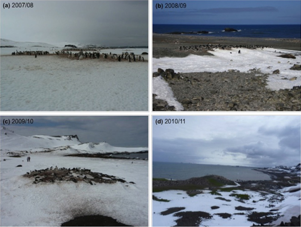 Interannual comparison of local conditions recorded at the Stranger Point colony, from 2007/08 to 2010/11: (a) 2007: first week of November; (b) 2008: 10 November; (c) 2009: 5 December; (d) 2010: last week of November.