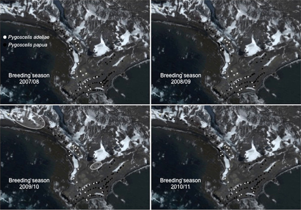 Comparison of the spatial distribution of the breeding groups of gentoo penguin (Pygoscelis papua) at Stranger Point, from 2007/08 to 2010/11. The ovals show the notable redistribution observed during the 2009/10 breeding season. The locations of the breeding groups of Adélie penguin (Pygoscelis adeliae) are included for comparison.