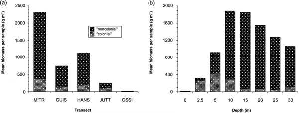 Distance from the glacier front, depth and angle of inclination influence the amount of sediment accumulated on the bottom. Generally, most sediment accumulates at the innermost localities (Svendsen et al. 2002). The outer transects, MITR and GUIS, have little accumulated silt on the hard-bottom even in the deepest samples at 30 m depth (Table 1), although some silt could be found between rocks and in pockets. The HANS transect had silt on the rock bottom from 15 m down to 30 m, even when the substratum had an angle of 30–50°. Along the two innermost transects, JUTT and OSSI, silt was recorded on the rocks at all depths below the tidal zone (Table 1).