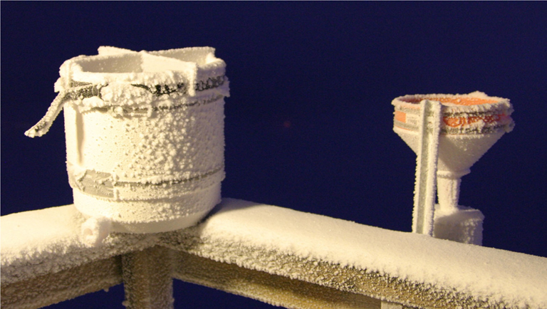 Bucket sampler for solid precipitation (left) and funnel sampler for liquid precipitation (right).