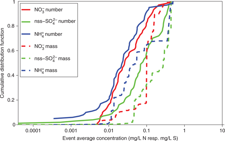 were in the range between 0.01 and 0.1 mg L−1 N, with a median of 0.02 mg L−1 N (Fig. 3). The majority of the event average concentrations of nss-