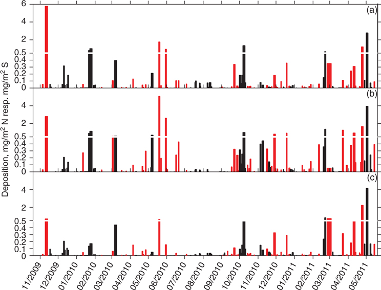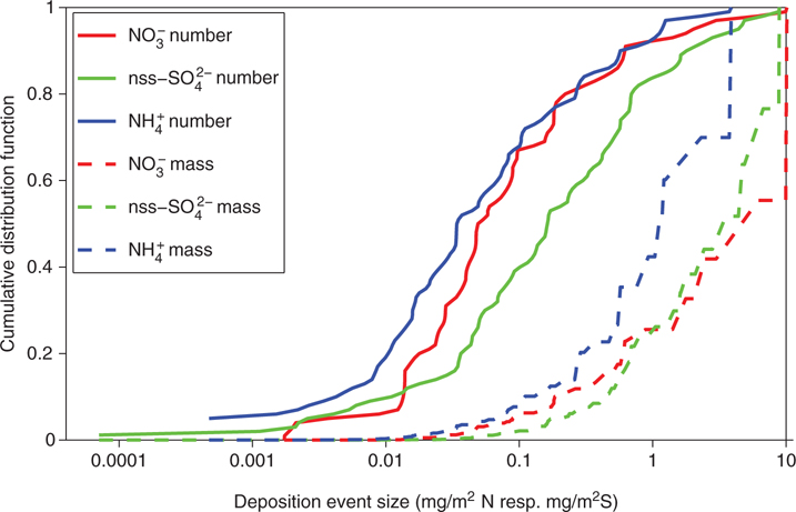 , half of the deposited mass was associated with events greater than 2 mg m−2 N, 0.6 mg m−2 N and 2 mg m−2 S, respectively.