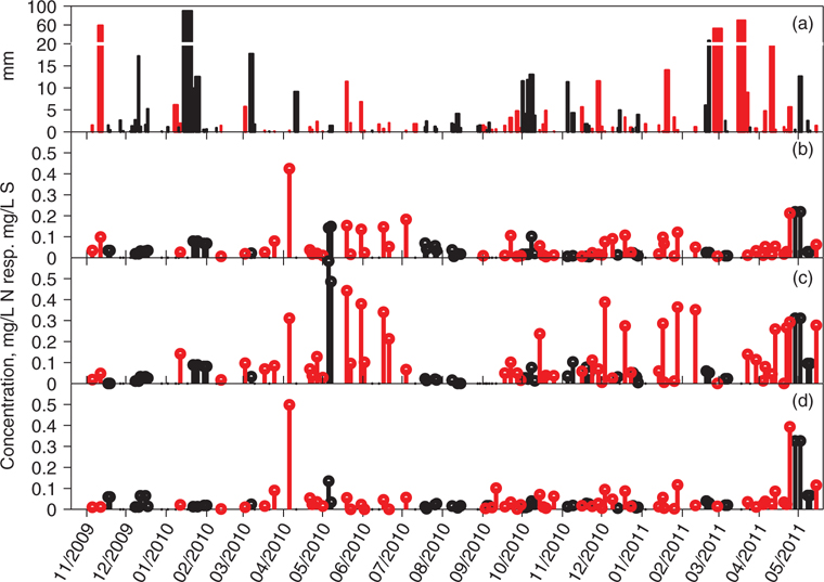 The mean event average concentration of the events in Group A was 0.05 mg L−1 N for , 0.11 mg m−2 S for nss-