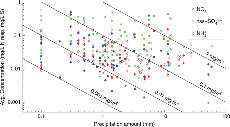 Scatter plot of precipitation amount versus event average concentrations. Filled markers indicate data from isolated and complete events. Diagonal lines show event deposition of ,