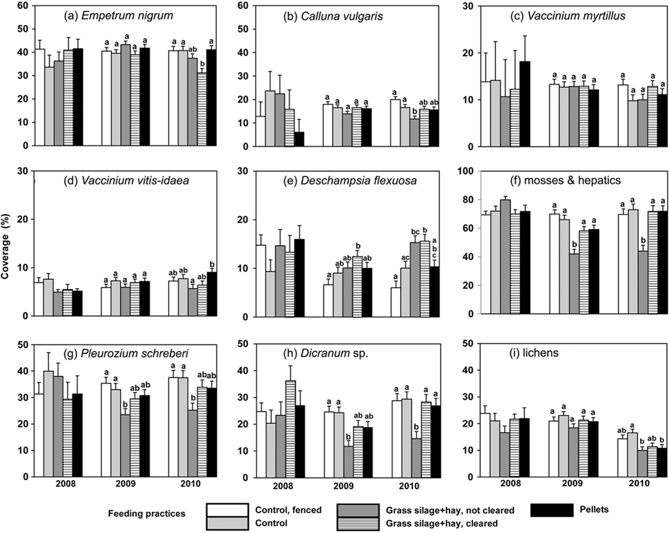 The mean (with standard error) coverage (%) of (a) Empetrum nigrum, (b) Calluna vulgaris, (c) Vaccinium myrtillus, (d) Vaccinium vitis-idaea and (e) Deschampsia flexuosa in the field layer, and (f) all mosses and hepatics, (g) Pleurozium schreberi, (h) Dicranum sp. and (i) all lichens in the ground layer of a sub-xeric heath forest before the feeding experiment was started (2008), after the first winter (2009) and the second (2010). The figures for 2008 are starting means, and those for 2009 and 2010 covariate-adjusted means (2008 values as a covariate) for feeding practices. The different letters denote differences between the feeding practices at significance level P=0.05, n=10 plots per feeding practice.