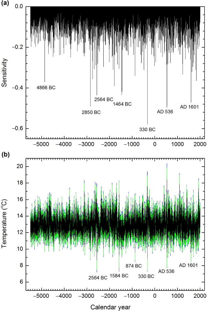 A look at the plot of the tree-ring variability reveals a characteristic paucity of anomalously poor growth in terms of dendrochronological sensitivity (Fig. 1a). The most negative years of growth are not clustered within a limited period but are spread over several millennia. Considering the late-Holocene (here, 1–2005 A.D.), the tree-ring record shows extreme drops in growth as having occurred in 1601 A.D. and 536 A.D. These years were reconstructed as having been exceptionally cool (Fig. 1b). For both of these years, the summer temperatures were reconstructed to have been cooler than 10°C on average, which is more than three standard deviations from the reconstructed mean of 13°C. The year 536 A.D. was followed by another year of reduced growth, in 542 A.D., during which the temperatures are reconstructed to have been nearly as cool as six years before (Fig. 2).