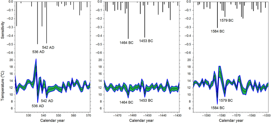 Of note, the events of 1464 B.C. and 1584 B.C. were followed by cool years 11 and five years later, respectively—in 1453 B.C. and 1579 B.C. These anomalies bring to mind the events in 536 A.D. and 542 A.D. (Fig. 2).