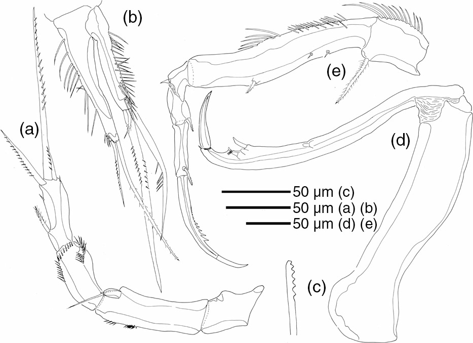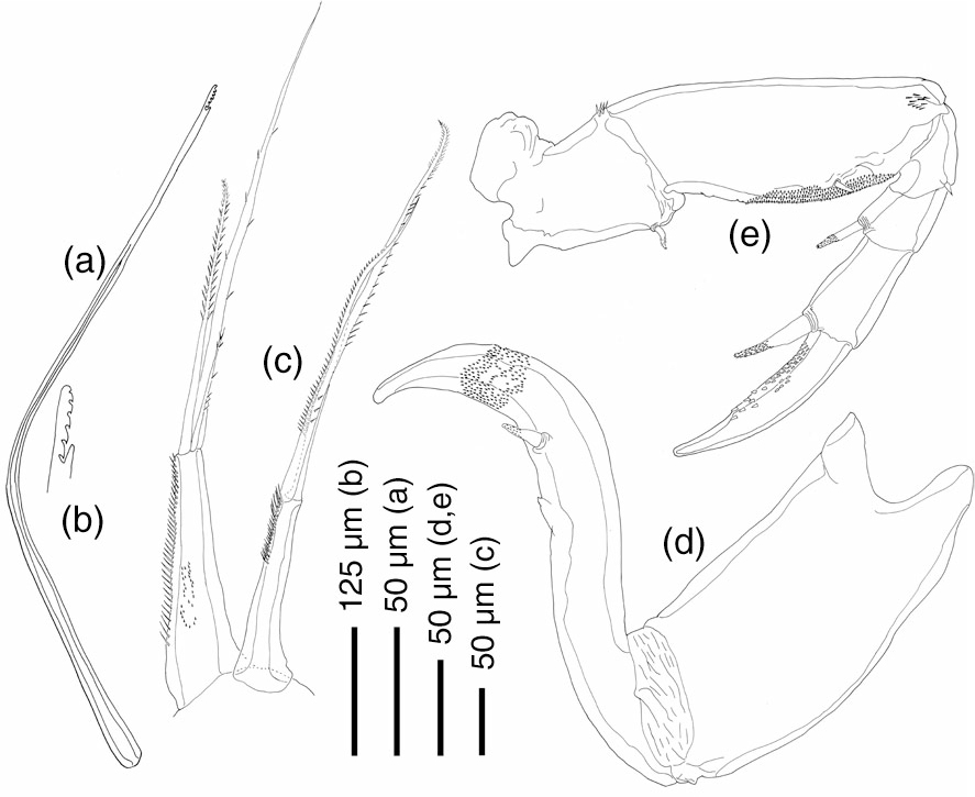 Maxilliped (Fig. 3e) five-segmented; syncoxa 89 µm long, with short seta on inner margin; basis 146 µm long, with small spiniform seta medially on inner margin and ornamented with spines on this margin. Endopod three-segmented, segments 1–3 measuring 36, 36 and 53 µm long, respectively. First endopodal segment with small seta on outer margin. Second and third endopodal segments with strong spiniform seta. Third segment with claw 103 µm long, curved distally and ornamented with fine spinules on inner margin.