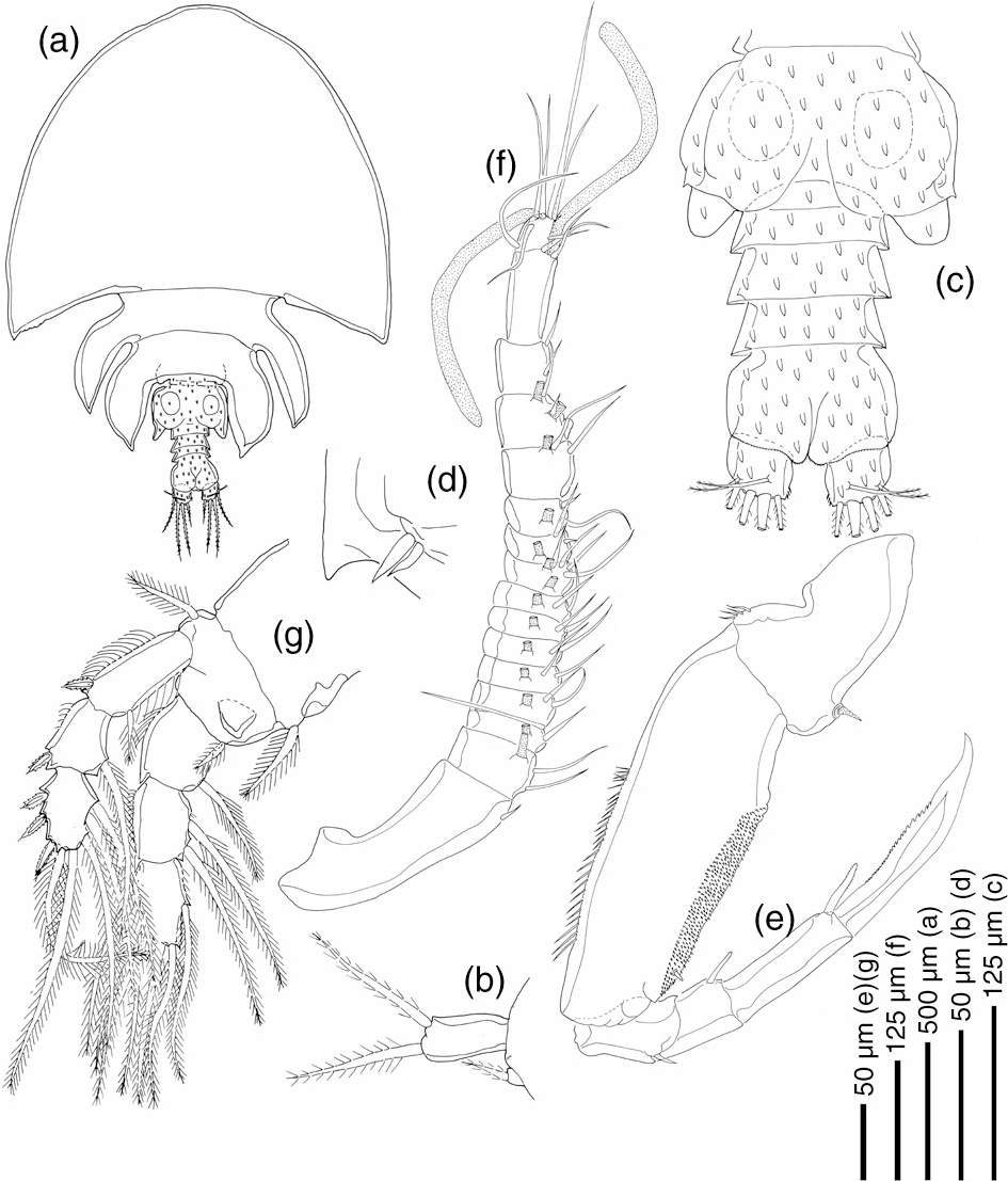 Maxilla (Fig. 7e) with 245 µm long, unarmed syncoxa and 320 µm long, distally curved claw with small plumose seta and ornamented with spinules near tip as figured. Maxilliped (Fig. 7f) five-segmented; syncoxa 110 µm long with short seta on inner margin and setules at outer corner; basis 285 µm long, with small spiniform seta medially on inner margin and patch of setules at middle length of outer margin. Endopod three-segmented, segments 1–3 measuring 45, 50 and 55 µm long, respectively. First endopodal segment with small seta on outer margin. Second and third endopodal segments with one plumose seta. Third endopodal segment with claw longer than entire segment (150 µm long), curved distally and unarmed.