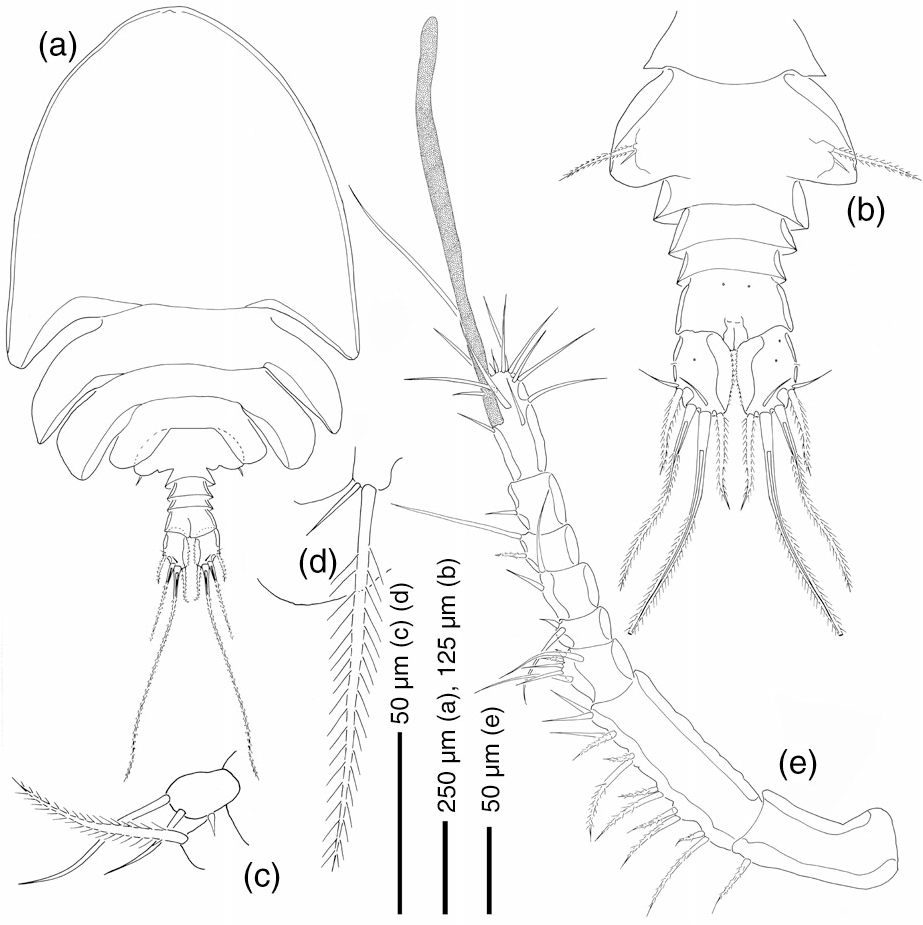 Fig. 6 Cryptopontius latus (Brady 1910) (female): (a) habitus, dorsal; (b) urosome dorsal; (c) leg 5; (d) genital area; (e) antennule.