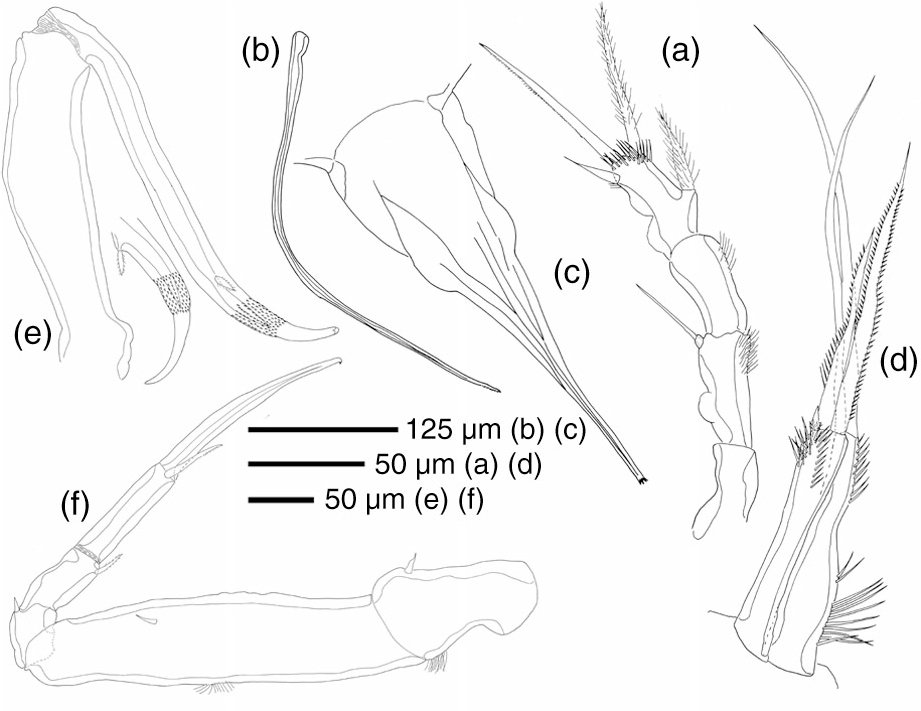 Fig. 7 Cryptopontius latus (Brady 1910) (female): (a) antenna; (b) mandible; (c) siphon, (d) maxillule; (e) maxilla; (f) maxilliped.