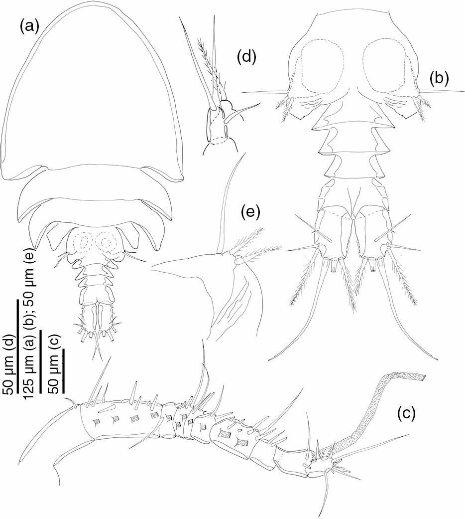 Antennule (Fig. 10e) 453 µm long, nine-segmented. Lengths of segments measured along posterior margins 71 µm (77 µm along anterior margin), 79, 15, 16, 59, 31, 32, 38 and 112 µm, respectively. Setation as follows: 1+1 setule, 8, 2, 2, 7, 2, 2, 1, 9+ ae.