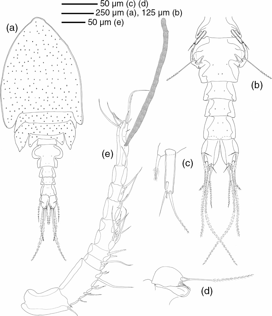 Fig. 9 Cryptopontius latus (Brady 1910) (male): (a) habitus, dorsal; (b) urosome, dorsal; (c) antennule; (d) leg 5; (e) leg 6.