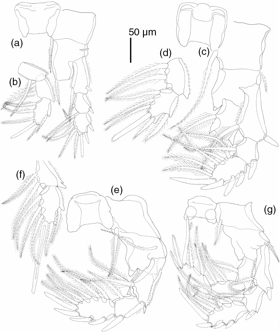 Fig. 12 Sestropontius italicae n. sp. (female): (a) leg 1; (b) endopod of leg 1; (c) leg 2; (d) two last endopodal segments of leg 2; (e) leg 3; (f) two last endopodal segments of leg 3; (g) leg 4.