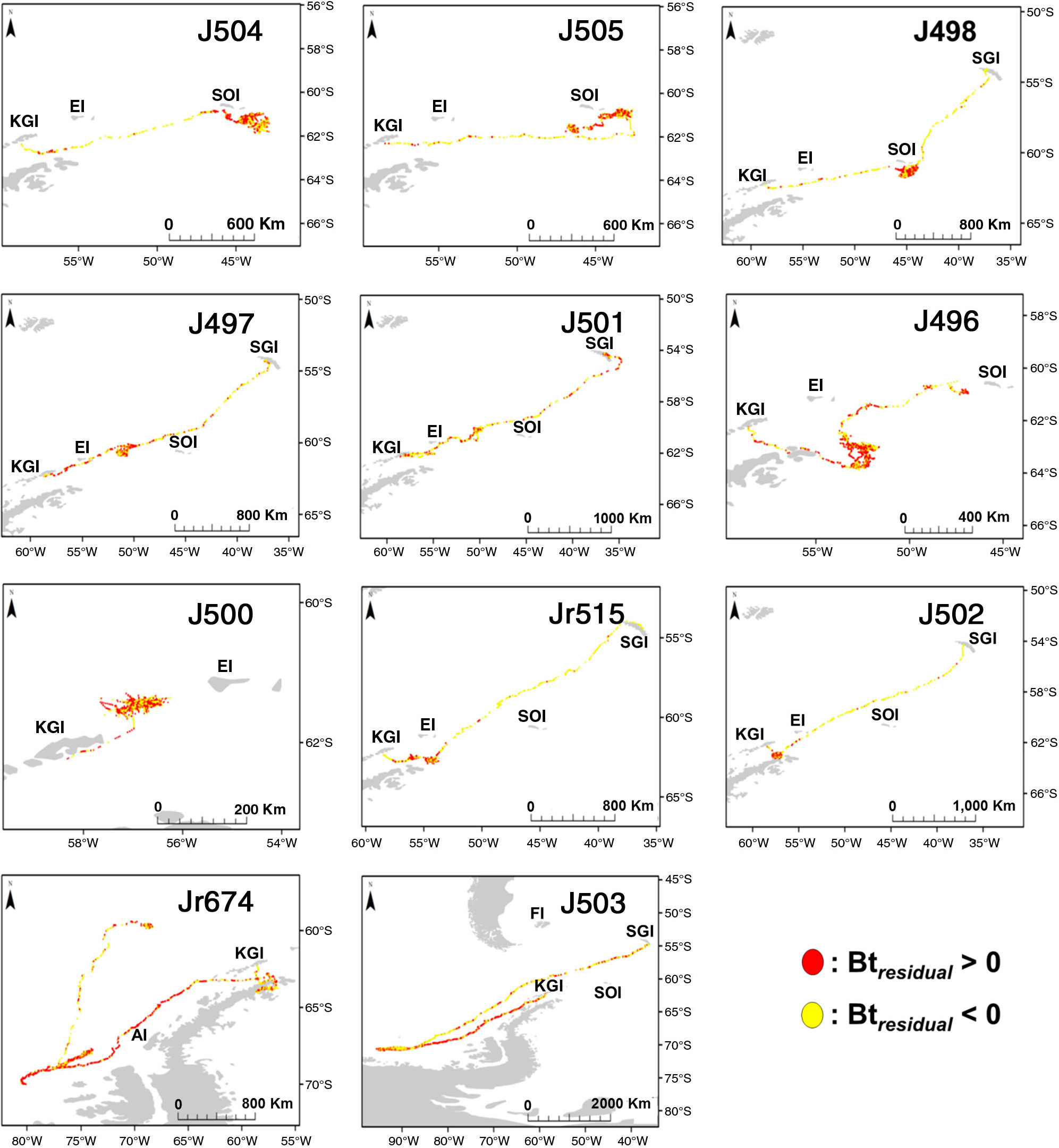 Dive locations of individual seals tracked from King George Island, indicating daily averaged positions of dives with increased bottom times (BTresidual