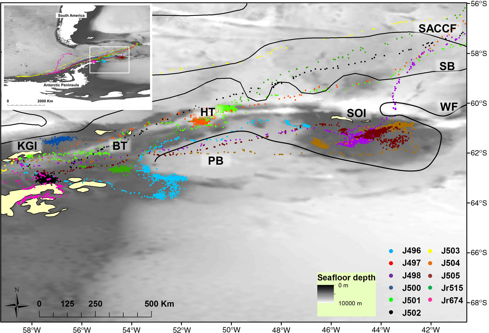 Map of the Scotia Sea area utilized by seals in this study. Approximate locations of the boundary fronts of the Weddell–Scotia Confluence are indicated by black lines. Positions of the boundary fronts were estimated from Heywood et al. (2004) and Orsi et al. (1995) and as displayed by Meredith et al. (2011). The inset shows the distribution of all seals tracked in this study and highlights the area displayed in the main image. The following features and place names are abbreviated: Southern Antarctic Circumpolar Current Front (SACCF); southern boundary of the Antarctic Circumpolar Current (SB); Weddell Front (WF); King George Island (KGI); Bransfield Trough (BT); Hespérides Trough (HT); Powell Basin (PB); South Orkney Islands (SOI).