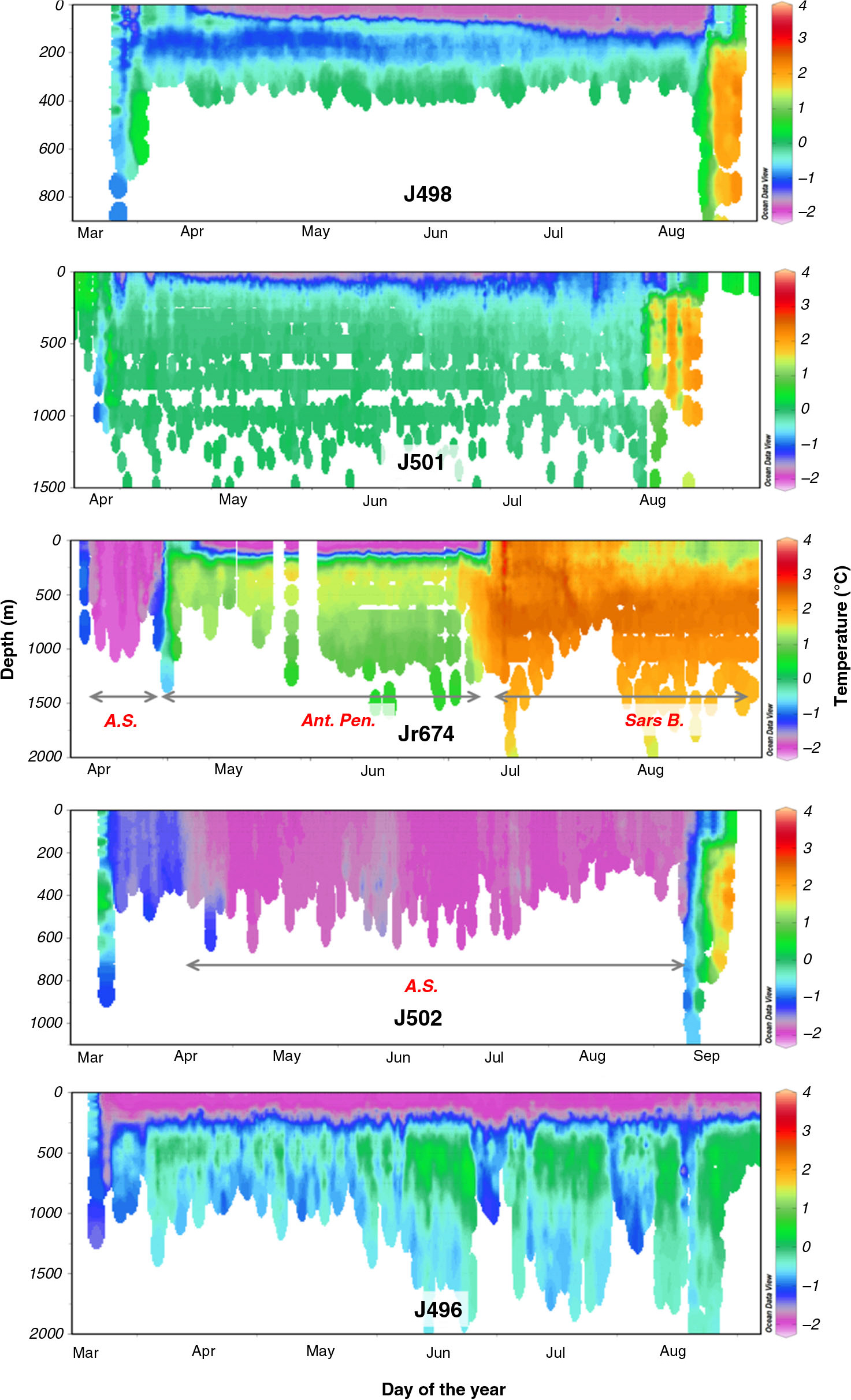 Temperature collected by selected seals illustrating a variety of environments encountered. The following terms are abbreviated: Antarctic Shelf (A.S.); Antarctic Peninsula (Ant. Pen.); Sars Bank (Sars B.).