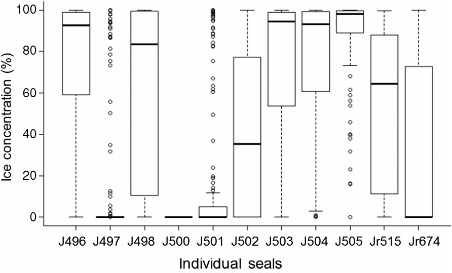 Box and whisker plot of daily averaged sea-ice concentrations of the dive locations of tracked seals in this study. The bold lines indicate medians, boxes indicate 25th and 75th percentiles, individual points are outliers and whiskers indicate 1.5 times the interquartile range, or the maximum values (when there are no outliers).