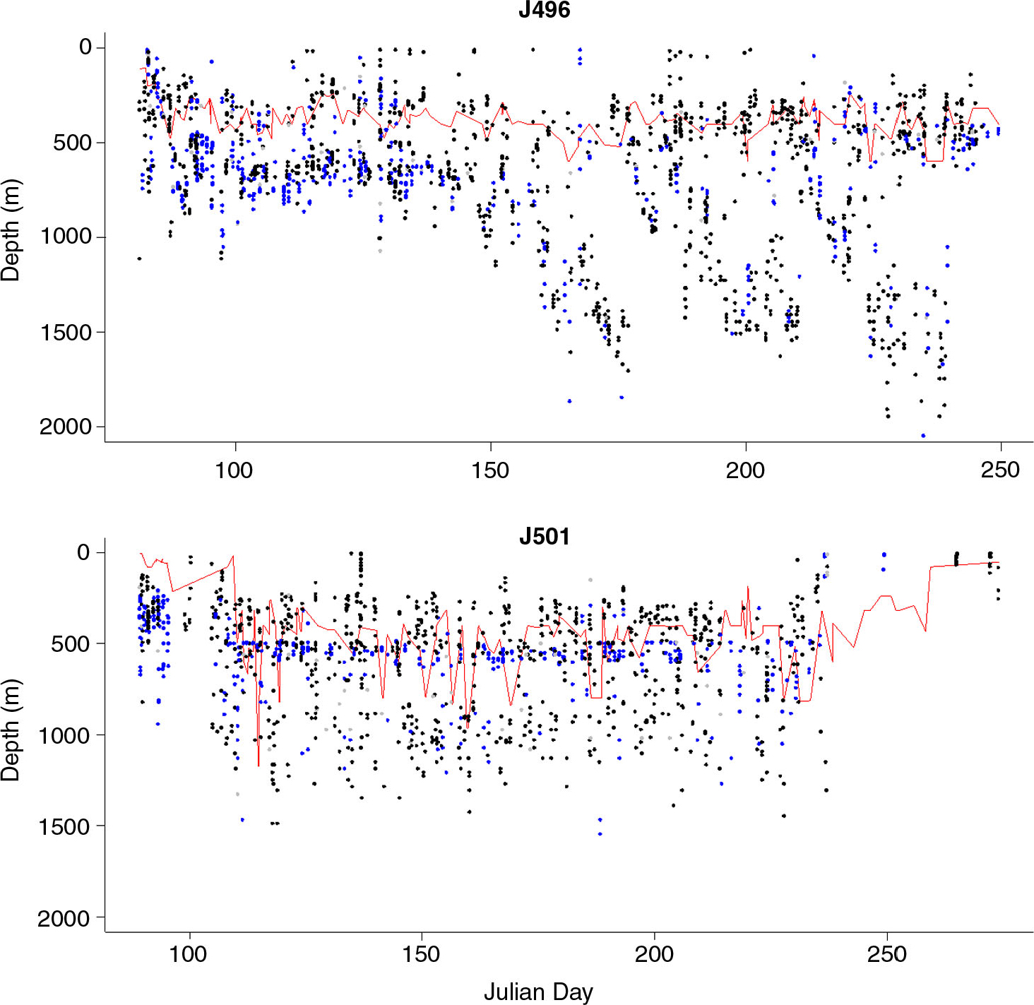 Example time-series plots of dive depths in relation to Tmax.depth (red line) for two seals, J496 and J501. Blue dots indicate daytime dives and black dots night-time dives.