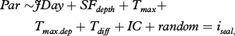 where Par = either DDEP, DDUR, SP or BTres; JDay=Julian day; SFdepth=seafloor depth (m); Tmax=maximum temperature (°C); Tmax.dep=depth of Tmax (m); Tdiff=temperature difference between maximum and minimum temperature (°C); IC=ice concentration (%); and iseal=individual seal (random term).