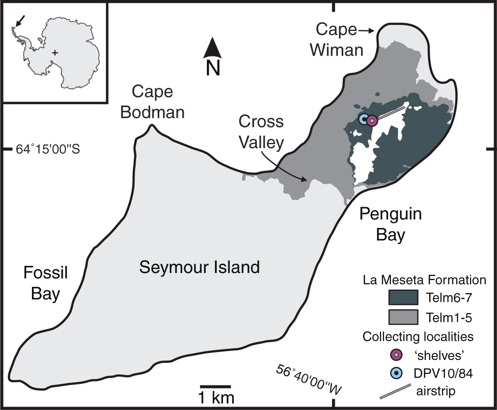 Map showing the location of Seymour (Marambio) Island, the La Meseta Formation and sampling sites.