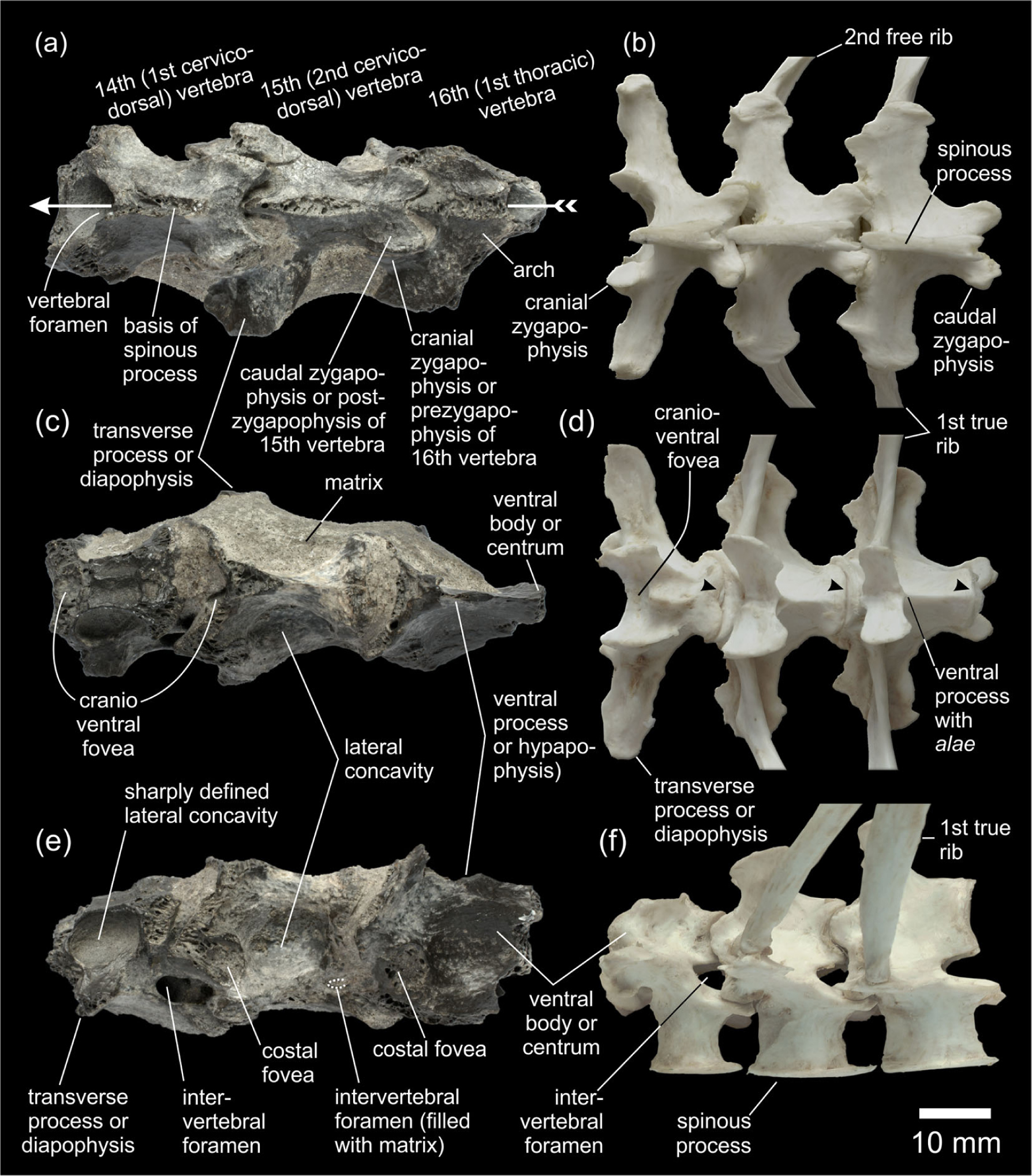 The specimens described earlier represent two series made of three articulated vertebrae, hence each of them obviously represent a contiguous segment of the spinal column. According to Baumel & Witmer (1993) and Müller et al. (2010, supporting information), the cervical and thoracic vertebrae in birds can be separated by elements transitional in configuration (cervicodorsal vertebrae; Fig. 2b, d, f). Both penguin fossils discussed here possess such combination of features. These characters are discussed below and allow interpreting each set of bones in terms of two cervicodorsal vertebrae followed by a single thoracic element.