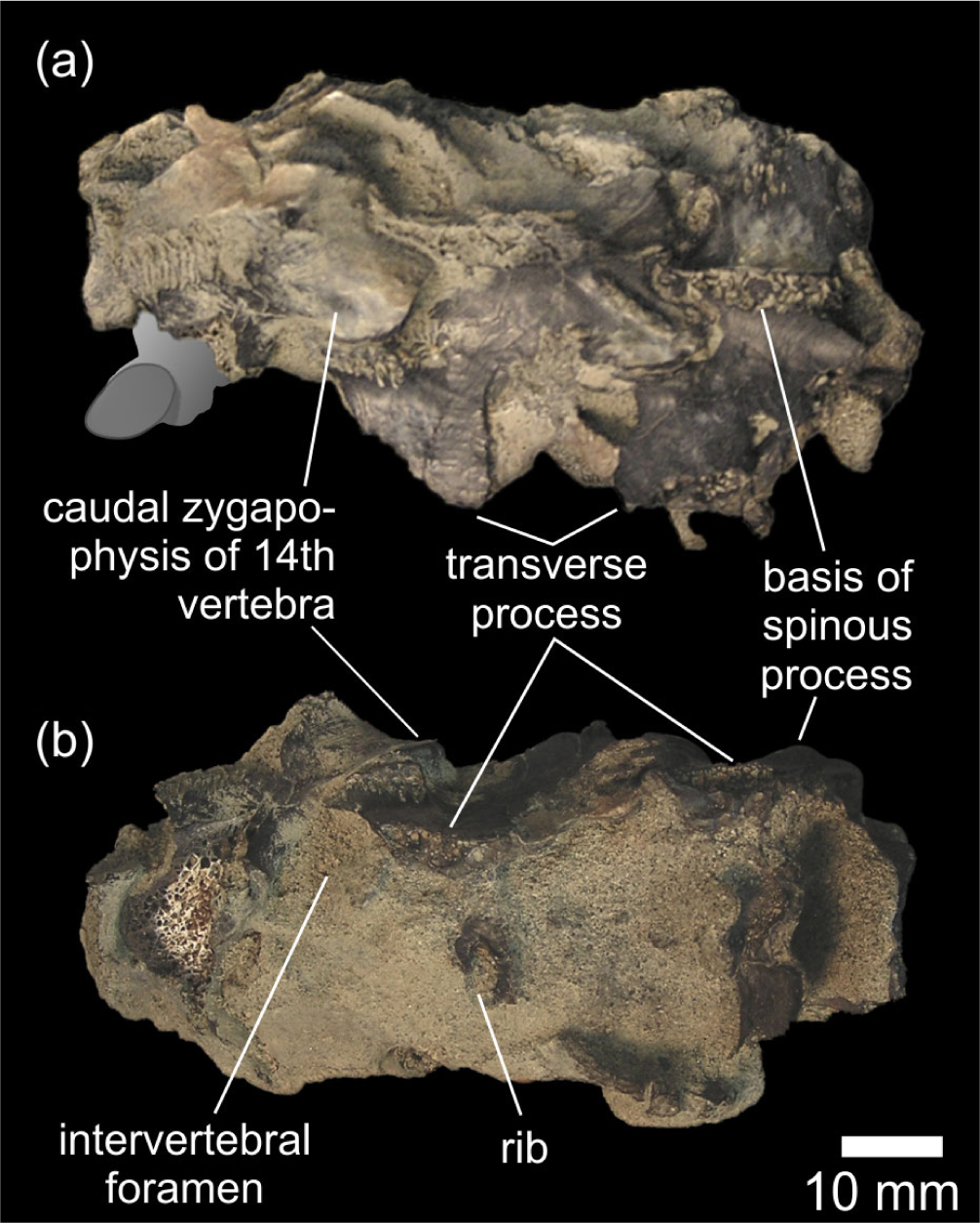 The lateral side of the specimen is rather hard to interpret with the exception of the condition of the transverse processes mentioned earlier and the conspicuous proximal part of a broken rib. The rib is ovoid in its cross-section and unequivocally articulates with the middle vertebra. The protruding bony remnant located ventrally to the transverse process of the caudalmost bone presumably represents another vertebra. Moreover, there appears to be the well-developed intervertebral foramen between two cranialmost bones and a slight incomplete outline of the lateral concavity of the anterior vertebra is recognizable.