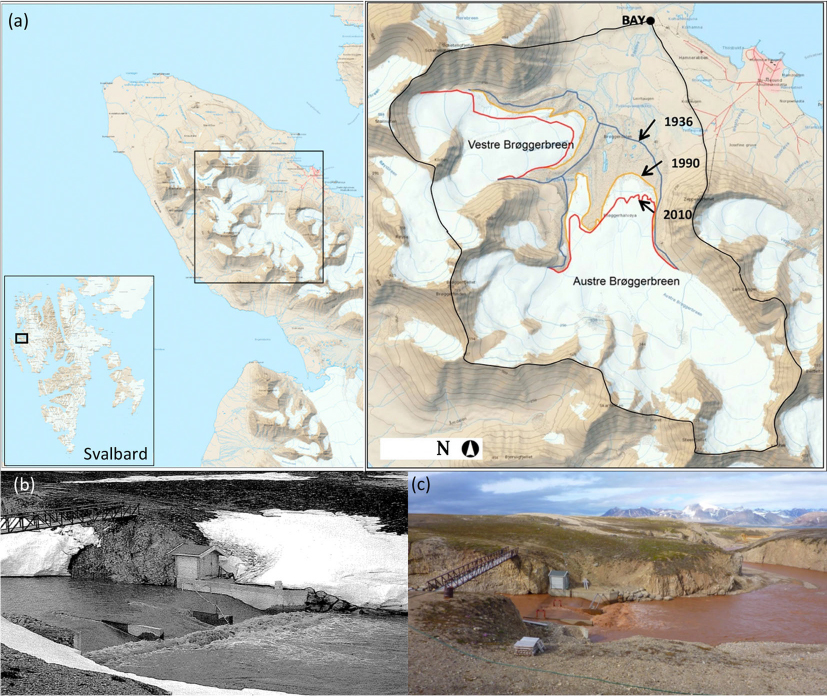 (a) Location of the sampling site (BAY: 78.9335 N, 11.838 E) on Brøggerhalvøya near Ny-Ålesund, Svalbard, showing the boundaries of the Bayelva catchment (in black) and glacier ice margins (maps modified from Svalbardkartet, Norwegian Polar Institute.). (b) BAY station in 1992 (photo by J. Bogen). (c) BAY station in 2010 (photo by A. Nowak).