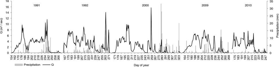 Mean daily discharge of Bayelva and total daily precipitation in 1991, 1992, 2000, 2009 and 2010. (Data sources: Norwegian Water Resources and Energy Administration and eklima.met.no.)