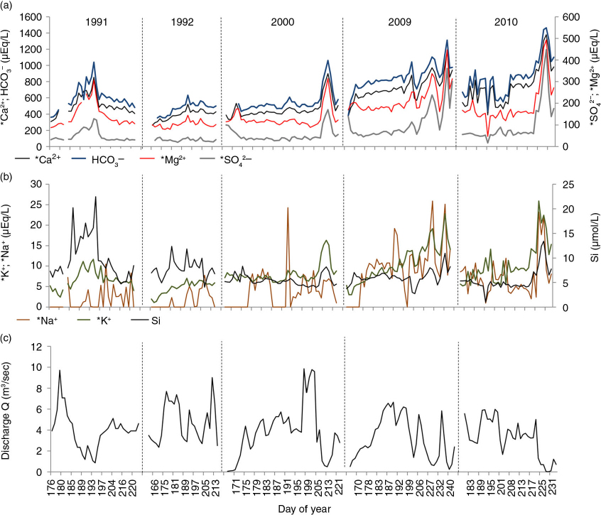 The time series of crustal ion concentrations in the Bayelva between 1991 and 2010: (a) Concentrations of ions associated with carbonate rocks; (b) concentration of ions associated with silicate rocks; (c) discharge of Bayelva at the time of sampling.