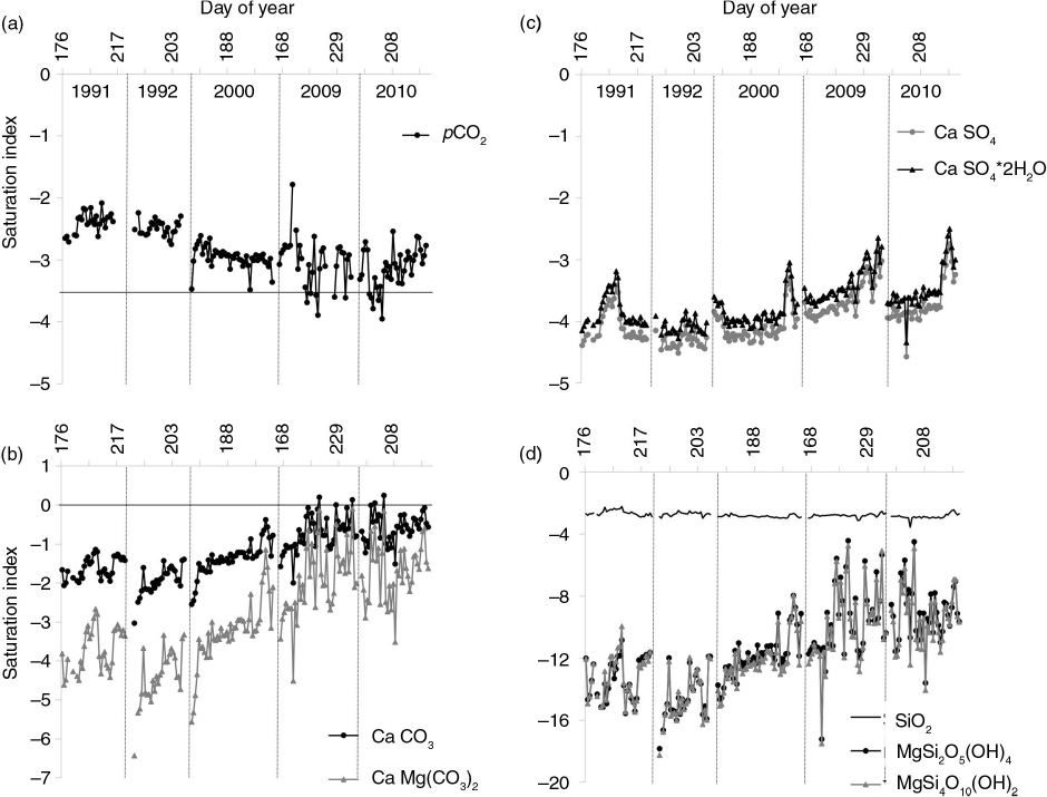 Time series of saturation indices of (a) pCO2, (b) carbonate, (c) sulphate and (d) silicate minerals in Bayelva between 1991 and 2010.
