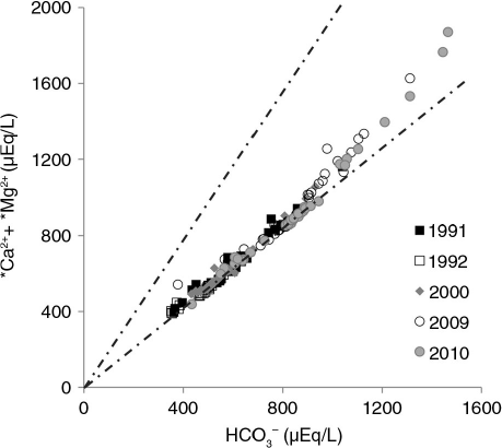 The relationship between carbonate-derived ions in Bayelva during the 1991–2010 period of records. Dashed lines specify 1:1 ratio (lower) indicating carbonation and 2:1 ratio (upper) indicating dissolution.