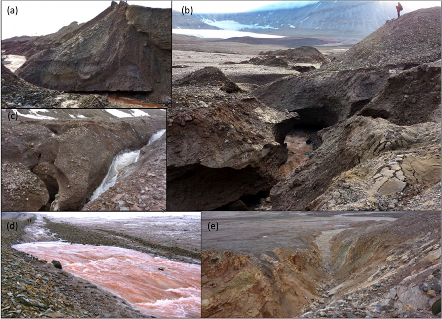 Meltwater transit along Austre Brøggerbreen terminus after the reorganization of a major flowpath in 2009: (a–c) new flowpath through sediments at the glacier terminus with a person for scale; (d) new portal created in 2009; (e) abandoned rock-wall channel. Pictures taken in July 2010.
