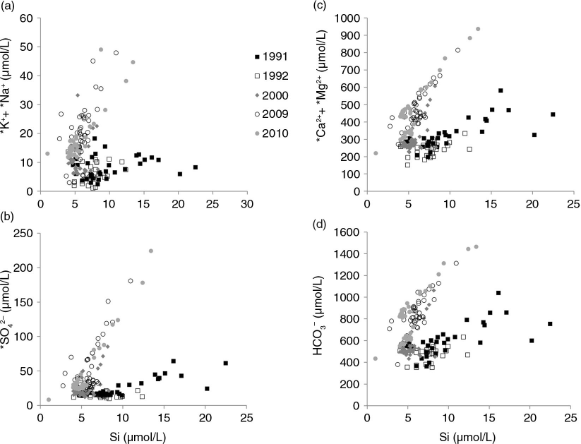 The changes in carbonate-derived solutes were accompanied by changes in solutes derived from silicate weathering such as *K+, *Na+ and Si (see Fig. 3). However, unlike the ions linked to carbonates, the relationship between Si and *K++*Na+ varied between the years (Fig. 9a), indicating a change in meltwater chemistry and therefore chemical weathering. Two groups were distinguishable and they consisted of years 1991, 1992, 2000 (June only) and 2000 (July, August), 2009, 2010. The former was characterized by low Si, low *K+, *Na+, while the latter by low Si and high *K+, *Na+. The same pattern was also observed in the ratios of *, *Ca2++ *Mg2+ and HCO3− to Si (Fig. 9b–d). The year 2000 seemed to mark a transition between 1991, 1992 and 2009, 2010. This agrees with the results of a recent study by Nowak & Hodson (2013), where changes in Bayelva hydrology, that followed changes in air temperature and precipitation, also became apparent in the same year. Based on the above results, it can be assumed that silicate weathering in Bayelva increased during 2000 (July, August), 2009 and 2010. Despite that, the general 1991–2010 trend in dissolved Si concentrations showed a slight decrease followed by the decrease in Si yields (Tables 3, 4). The exceptions were short-term, end of season Si maxima (Fig. 3) that will be discussed below along with the end of season concentration maxima of other crustally derived ions. The phenomenon of increased silicate weathering throughout the entire period of records and a slight decreasing trend of dissolved Si concentrations also require explanation. This is offered below.