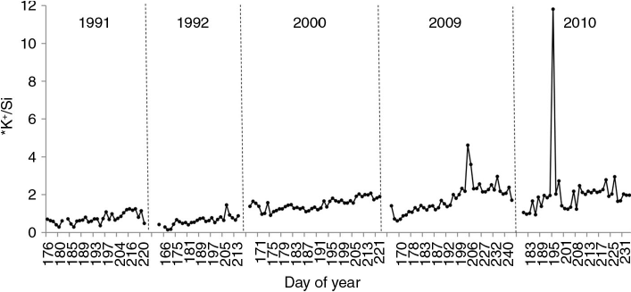 The change in ratio of rock derived potassium (*K+) to dissolved silica (Si) during the 1991–2010 period of records in Bayelva.