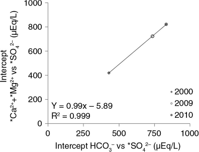 intercepts in August–September 2000, 2009 and 2010 and 0.99±0.01 gradient (see Fig. 13) indicated that about 99% of H2CO3 dissolved carbonates and the remaining dissolved silicates. What is interesting is that the amount of carbonate acid hydrolysis nearly doubled between 2000 and 2010 which according to Wadham et al. (2010) could be an indication of increased proportion of fine sediments in the meltwaters. This also placed Bayelva runoff between subglacial waters of polythermal glaciers such as Midre Lovénbreen (years 1991, 1992 and 2000) and Finterwalderbreen (years 2009, 2010) presented as well by Wadham et al. (2010). Furthermore, mean ratios of *Ca2+,*Mg2+ versus HCO3− (above 1) and *Ca2+ versus HCO3− (below 1) indicated that *Mg2+ and *Ca2+ were also acquired from/involved in other reactions. Hence, to explain the ratio above 1, additional regression models were developed. For example, high R2 values for associations between *Mg2+ and Si (0.99 in 2000; 0.97 in 2009 and 0.99 in 2010; p=0.05) and low intercepts (3.35±7.2 in 2009, 3.80±6.6 in 2010) suggested silicate weathering was one of the additional and most likely sources of *Mg2+. Regression models performed on other crustally derived ions (see Table 4) indicated that SO/SD was more responsible for the end of season solute acquisition than SO/CD. This would also explain the increase in dissolved Si during that time, since one of the products of SO/SD is highly soluble silicic acid. In addition, mean ratios of *Ca2+ versus HCO3− lower than 1, as indicated above, were thought to be caused by uptake of *Ca2+ released during carbonate carbonation and liberation of *K+. This would account for and high R2 values in regression models between *K+ and *Ca2+ (0.90 in 2000, 0.74 in 2009 and 0.97 in 2010, p=0.05). Therefore, in addition to carbonate carbonation, SO/SD and SO/SD supplying ions to Bayelva meltwaters at the end of ablation season, quick cation exchange reactions were also taking place.