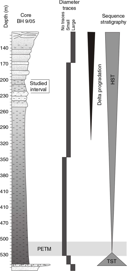 Stratigraphic section inferred from core BH9/05. A general trend of the trace fossil diameters and system tracts is represented, together with the location of the interval analysed in this study (modified from Nagy et al. 2013). The following terms are abbreviated: highstand system tract (HST); transgressive system tract (TST); Palaeocene–Eocene Thermal Maximum (EPTM).