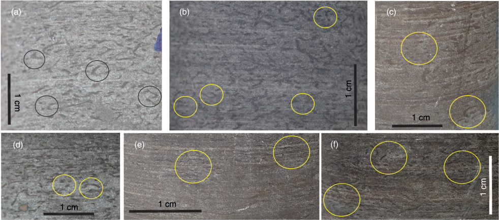 Evolution in turbiditic Bouma sequence (Td–Te). (a) Case D in Fig. 8, showing gradual transition from a bioturbated interval with disperse, abundant, large Phycosiphon incertum to small, concentrated Phycosiphon, and then a laminated interval (interval 1; 222.52 cm). (b) Case E in Fig. 8, showing a laminated interval with horizons of small Phycosiphon and finally a laminated interval (interval 1; 222.66). (c) Case F in Fig. 8, showing the transition from a bioturbated interval with disperse, abundant, large P. incertum to a laminated interval with patches of small Phycosiphon and finely a laminated interval (interval 2; 226.26 cm).