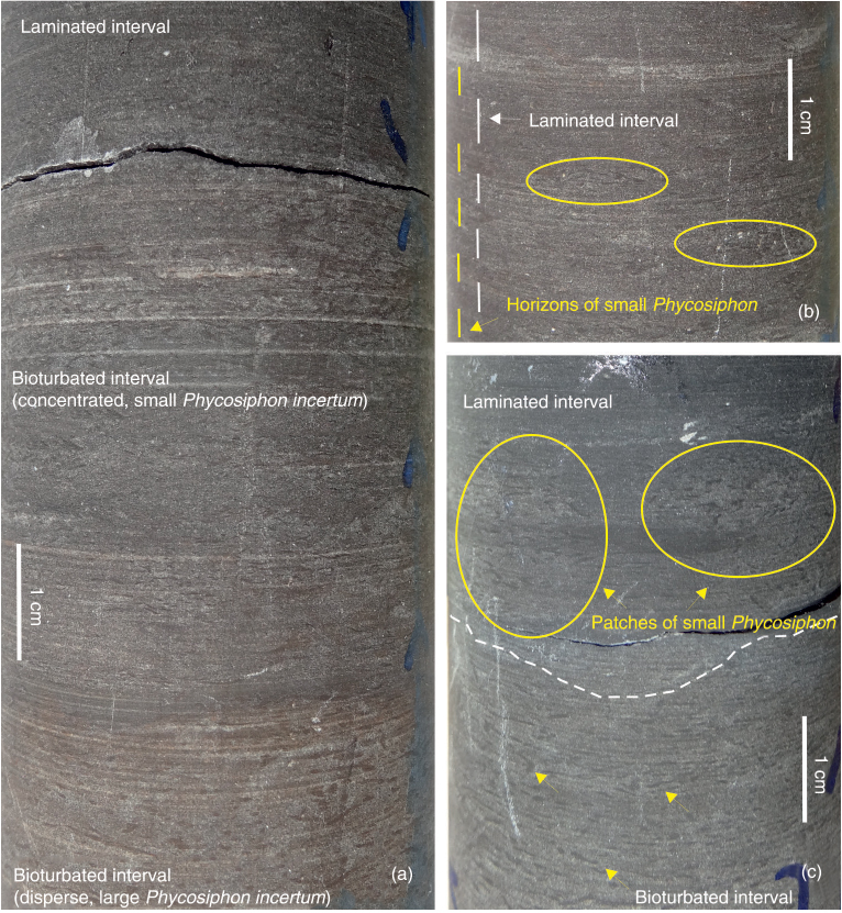 Variations in P. incertum features within the laminated to bioturbated intervals include: (a) fully laminated intervals, consisting of millimetre-scale laminae with scarce or even absent P. incertum, (b) highly bioturbated intervals, either sparsely bioturbated with larger P. incertum, or intensely bioturbated intervals with small-sized forms and (c) bioturbated to laminated intervals, appearing as weakly laminated intervals with densely packed horizons or as patches of small P. incertum.