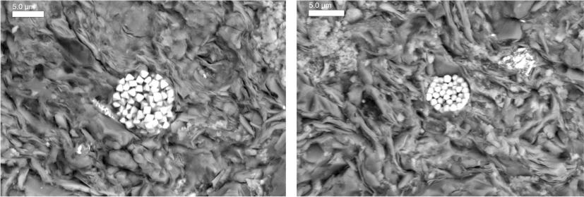 Back-scattered electron image of pyrite framboids between clay minerals and quartz grains of the well-laminated intervals of the core. Scale bar 5 µm.