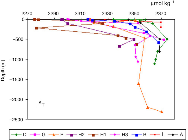 Figure 3 shows the AT as a function of depth at all of the stations. Generally, the AT profiles in the continental shelf stations had the lowest values in surface water (from 2275 to 2346 µmol kg−1), an increasing gradient reaching the maximum values (from 2343 to 2374 µmol kg−1) at ca.500–700 m, and then lower values at deeper depths. The station P, sampled offshore, showed an increase in AT values from ca. 1700 m to the deepest sampled depth (ca. 2300 m). At the surface, the highest values were measured at stations L, D and A (2328, 2334 and 2346 µmol kg−1, respectively).