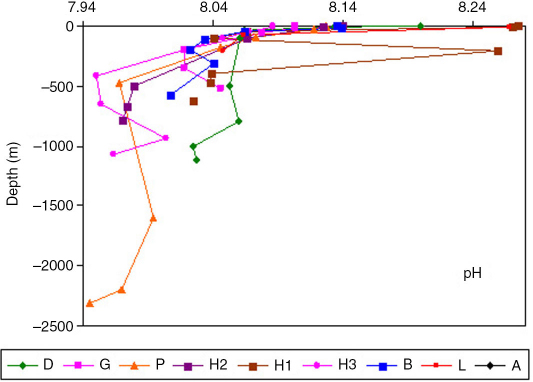 The pHin situ vertical distribution is shown in Fig. 4. The pHin situ has high and variable values in the surface layer (from 7.890 to 8.033 between 0 and ca.100 m), then an abrupt drop with depth to approximately 100–400 m, followed by a slight increase and nearly constant values. At the surface, the lowest values were measured at stations H2, H3, G, B and P (8.108±0.023), while stations D, L, A and H1 showed a higher variability and the highest pH values (8.186±0.088). The same trend was observed in the subsurface layer too. An increasing gradient of the pHin situ can be observed from the offshore to the Ross Sea shelf stations, particularly at intermediate depths around 300–500 m. The left-most profile in Fig. 5 refers to station H3 sampled in the Glomar Challenger Trough (GCT; Fig. 1), where the absolute pHin situ minimum (7.950) was found in correspondence to the CDW intrusion. Comparable values were measured at station H2, sampled as well as station H3 in the GCT and at station P offshore the Drygalski Trough (DT; Fig. 1), the other well-known intruding area of the CDW in the Ross Sea.