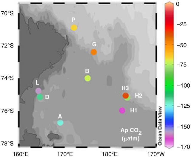 The seasonal ice coverage strongly impacts the cycling of chemical species and biological processes. Significant sea-ice coverage restricts CO2 sea–air exchange during winter in the Ross Sea and thus limits the equilibration of the Antarctic Surface Water (AASW) with the overlying atmosphere. As a result of the heterotrophic activities, the AASW is supersaturated with CO2 and undersaturated in dissolved oxygen (O2) (Sweeney 2003). Melting of pack-ice and warming of AASW are responsible for water column stratification, which favours the phytoplankton bloom in summer. Phytoplankton photosynthetic activities cause a reduction in the sea-surface partial pressure of CO2 (pCO2) and an increase of O2. Differences in the strength of the water column stratification, in the upper mixed layer (UML) and in the algal population can account for significant differences of the pCO2 drawdown. In particular, the CO2 drawdown measured for diatoms is much lower than that measured for Phaeocystis antarctica (Arrigo et al. 1999; Feng et al. 2010). The sea-ice extension and disappearance, and consequently the sea–air exchange of CO2 can also be impacted by large-scale climate signals (e.g., El Niño Southern Oscillation, Southern Annular Mode), as well as by large icebergs calving off the face of the Ross Ice Shelf (Arrigo & Van Dijke 2004; Massolo et al. 2009). Recently, fine-scale variability in pCO2, in the Ross Sea polynya (RSp), located in the south-western Ross Sea at about 75.51°S, 179.21°E, has been documented, exhibiting significant differences between the early spring and summer. This variability was also found to be coupled to the heterogeneity in underlying physical and biological variables (e.g., sea-ice cover and chlorophyll-a) (Tortell et al. 2011).