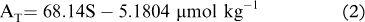 Pair-wise Pearson correlation coefficients were computed to examine the relationships between inorganic C parameters and hydrographic measurements. The AT and the salinity were significantly and positively correlated (Pearson's r=0.86, number of samples=57), according to the following relationship: